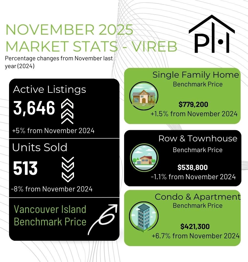 CONTINUED STABILITY REFLECTS CONFIDENCE IN HOUSING MARKET The Vancouver Island Real Estate Board (VIREB) recorded 513 unit sales (all property types) in November 2025, down eight percent from one year ago. Year-over-year active listings (all property types) were 3,646, up five percent from the previous year. In the single-family category (excluding acreage and waterfront), 259 homes so Read more →