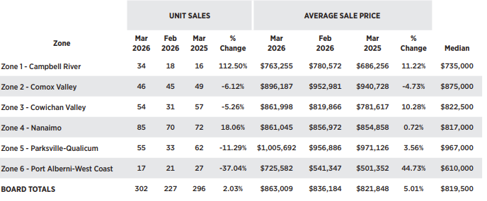 The Vancouver Island Real Estate Board (VIREB) recorded 636 unit sales (all property types) in March 2026, up one per cent from one year ago. Year-over-year active listings (all property types) were 3,776, up two percent from the previous year.